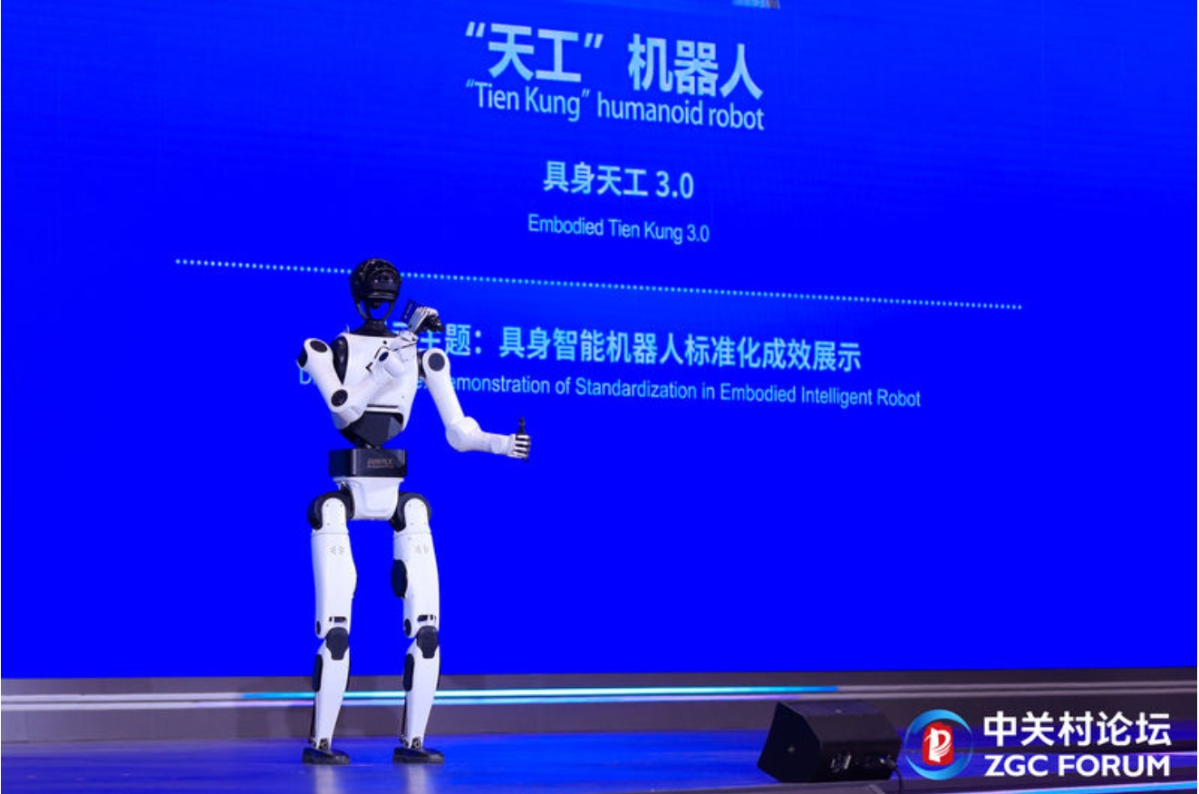 在论坛的展示环节,具身智能机器人“天工3.0”登台演讲,生动呈现了标准化如何推动科技创新从实验室走向产业化。