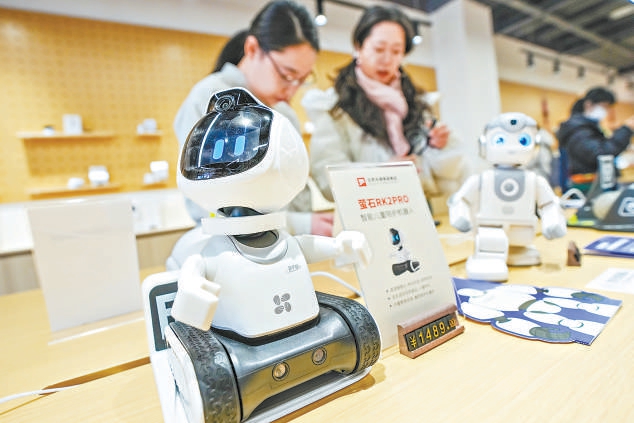 在智能产品区,一台陪伴机器人主动与顾客打招呼。
